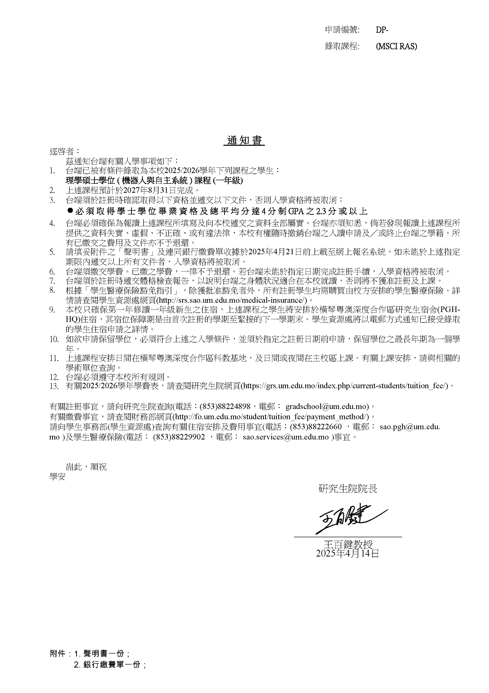关同学定于2025年7月毕业于广州大学,成绩优秀,获得澳门大学机器人与自主系统硕士录取。