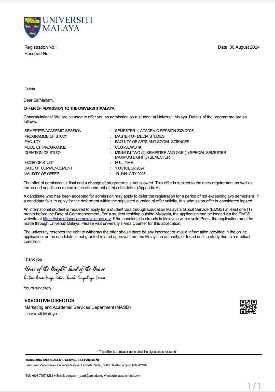 丁同学是深圳大学中文专业毕业学生,在广留服资深顾问的帮助下,丁同学获得世界名校马来亚大学的媒体研究硕士2024年秋季入学的录取。